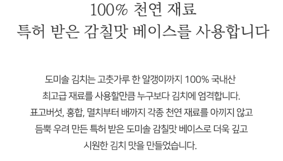 여러 리뷰들을 보면 도미솔 김치는 배송 상태가 일정하지 않다고 합니다. 김치는 만들어진 이후 계속해서 익어가는 식품이기 때문에 스피드가 생명인데 이 부분은 개선이 되었으면 하네요. 물론 생김치를 선호하지 않는 분들에게는 나쁘지 않을 듯합니다. 맛있는 김치와 함께 맛있는 식사 하시기 바랍니다.