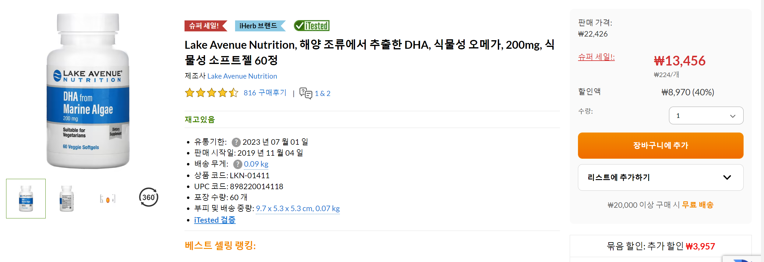 그렇다면 현명한 선택을 하기 위해서는 이제 가격을 따져봐야 할 것 같습니다. 흡수율 차이가 미비한테 가격이 훨씬 비싸면 곤란하겠지요. 위에서 설명한 대로 중금속 우려 때문에 요즘에는 해양식물에서 추출한 오메가 3을 선호하는 추세입니다. 식물성 알티지 오메가 3은 사실 그렇게 시중에 종류가 많지 않더라고요. 한국에서도 최근에 식물성으로 만든 제품이 많이 나오고 있는데요, 아이허브에서 지금 40%나 세일하는 제품이 있기에 오늘 한번 소개해 보겠습니다.